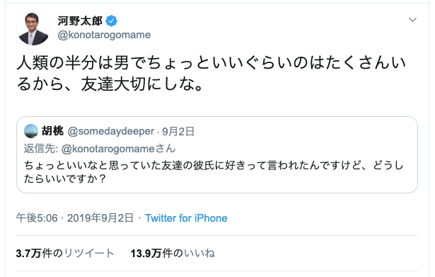 9月初頭、河野太郎防衛大臣(当時は外務大臣)と、フォロワーとのこんな対話が話題となった。