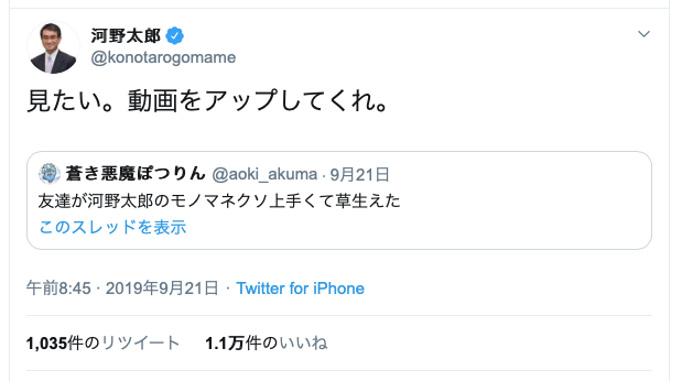 さらに河野氏は、上記ようにメンション(「@ユーザー名」が含まれたツイート)が無いツイートとの対話も積極的に楽しんでいる。これは、日頃から河野氏がエゴサーチを行なっているからこそ生み出せる対話であり、フォロワーへのウィットな返答だけでなく、そのエゴサーチ力の高さもTwitterユーザーの中ではよく知られている。