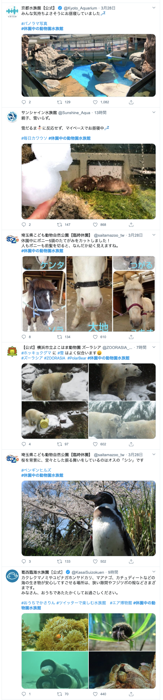 京都水族館(@Kyoto_Aquarium)や神戸どうぶつ王国(@kobe_doubutsu)などの近畿地域の水族館や動物園がきっかけとなり、瞬く間に全国の水族館/動物園が賛同し、毎日を楽しませてくれているハッシュタグが「#休園中の動物園水族館」だ。