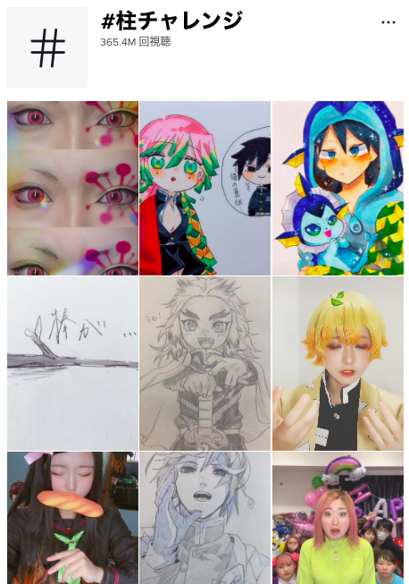 「鬼滅の刃」を題材とした「#柱チャレンジ」は、執筆時点で3億6千万回(!)を超える視聴数で、リップシンク、声真似、コスプレ、イラストなど、ユーザーたちがさまざまな手法で「柱」を演じている。