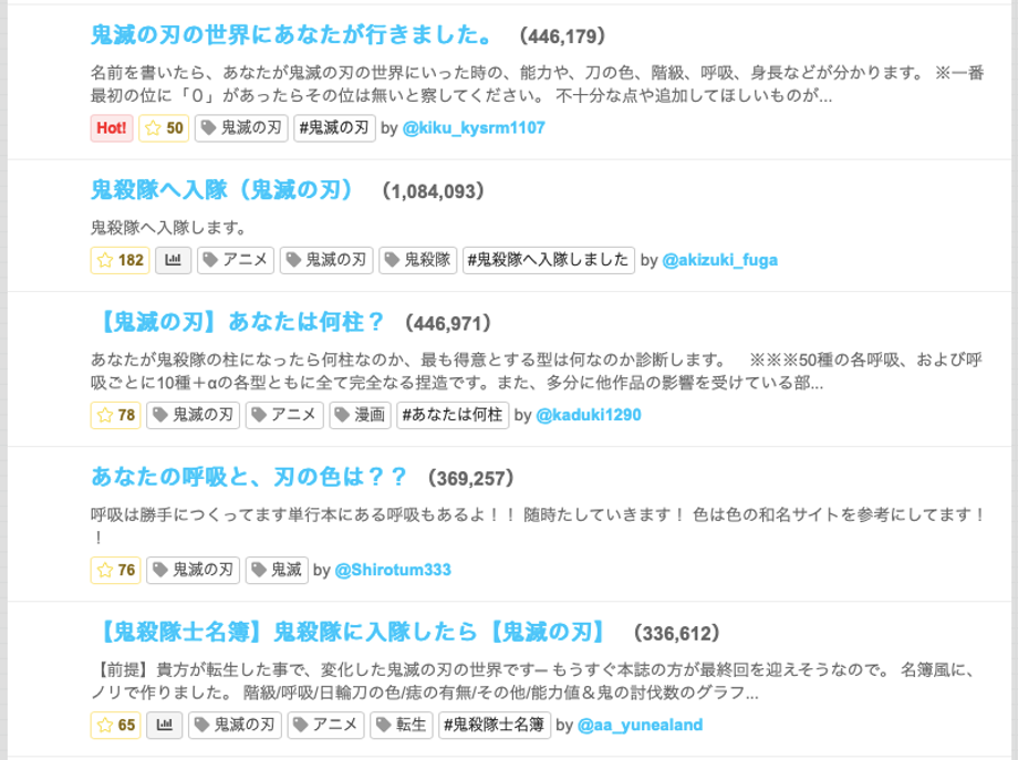 この診断メーカーで「鬼滅の刃」と検索すると、約180の診断がヒットし、参加者数が100万人を超える診断メニューも存在する。よくこんなアイデアが浮かぶなと感心してしまう診断メニューも多い。