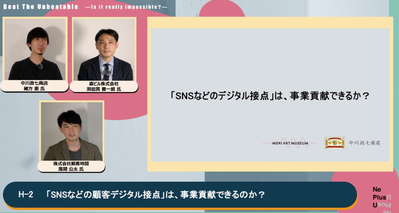 9月に開催されたオンラインイベント、ネプラス・ユー。筆者は『「SNSなどの顧客デジタル接点」は、事業貢献できるのか?』のテーマで、森美術館 マーケティンググループの洞田貫晋一朗氏と、中川政七商店 取締役CDOの緒方恵氏とともに、顧客とのデジタルの接点がリアルな場に対してどのような効果をもたらしているのか、また、デジタル接点のさらなる活用の可能性についてディスカッションを行なった。