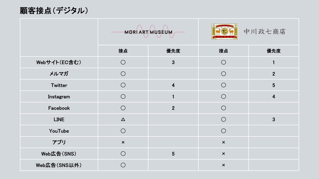 森美術館と中川政七商店の顧客デジタル接点の優先度は?