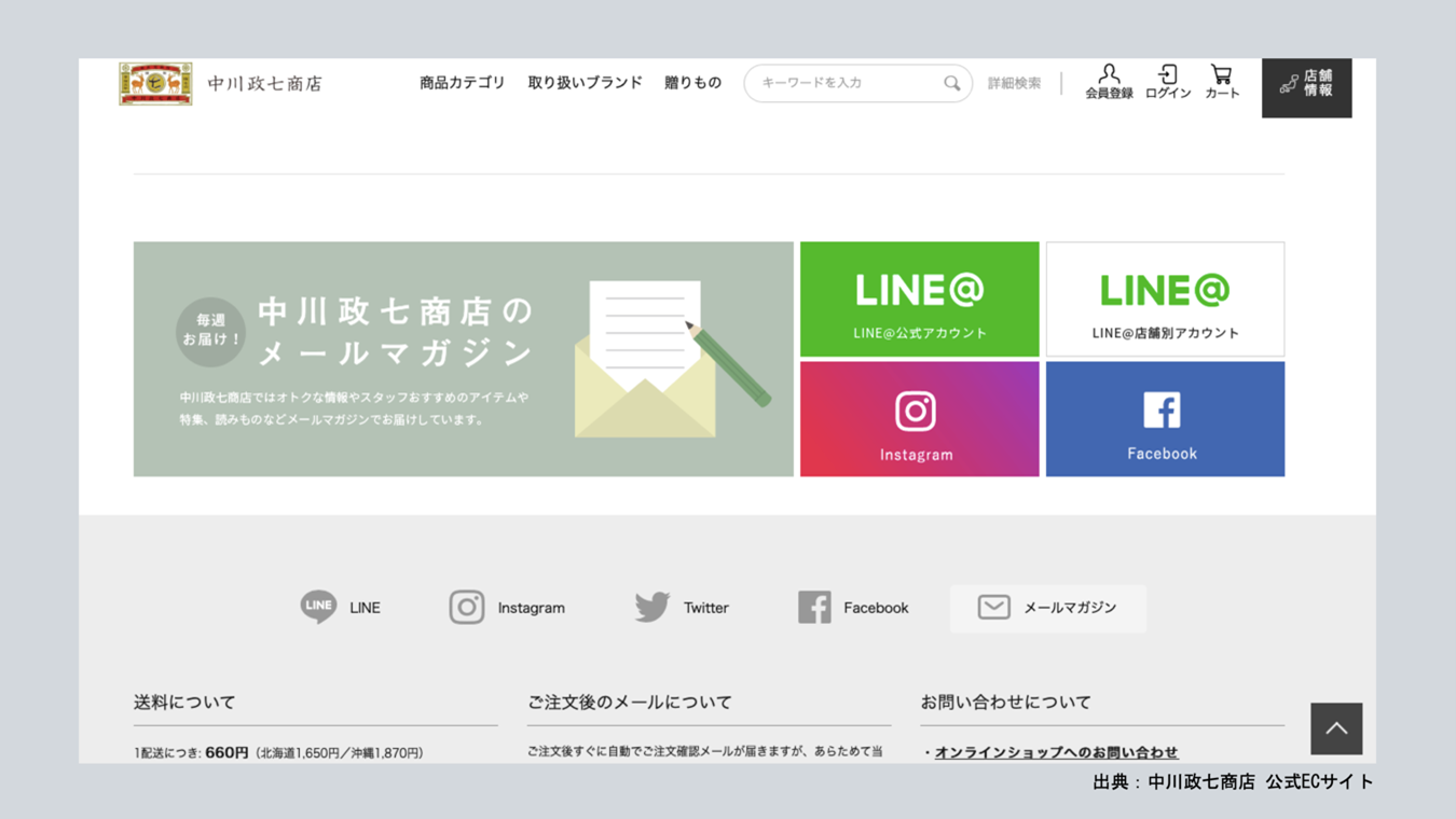 その姿勢は、同社のECサイト を開くと一目瞭然。SNSアカウントのフォローを促す案内はどの企業のECサイトにも設置されているが、中川政七商店で最も目を惹くのはメルマガの登録バナーだ。