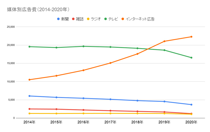 コロナ禍で、衰退トレンドにあった産業やビジネスモデルが一気に縮小する現象が起きています。「日本の広告費2020」(電通発表)でも、新聞は前年比81.1%、雑誌が73.0%、ラジオ84.6%、地上波テレビ88.7%と大幅に縮小しました。