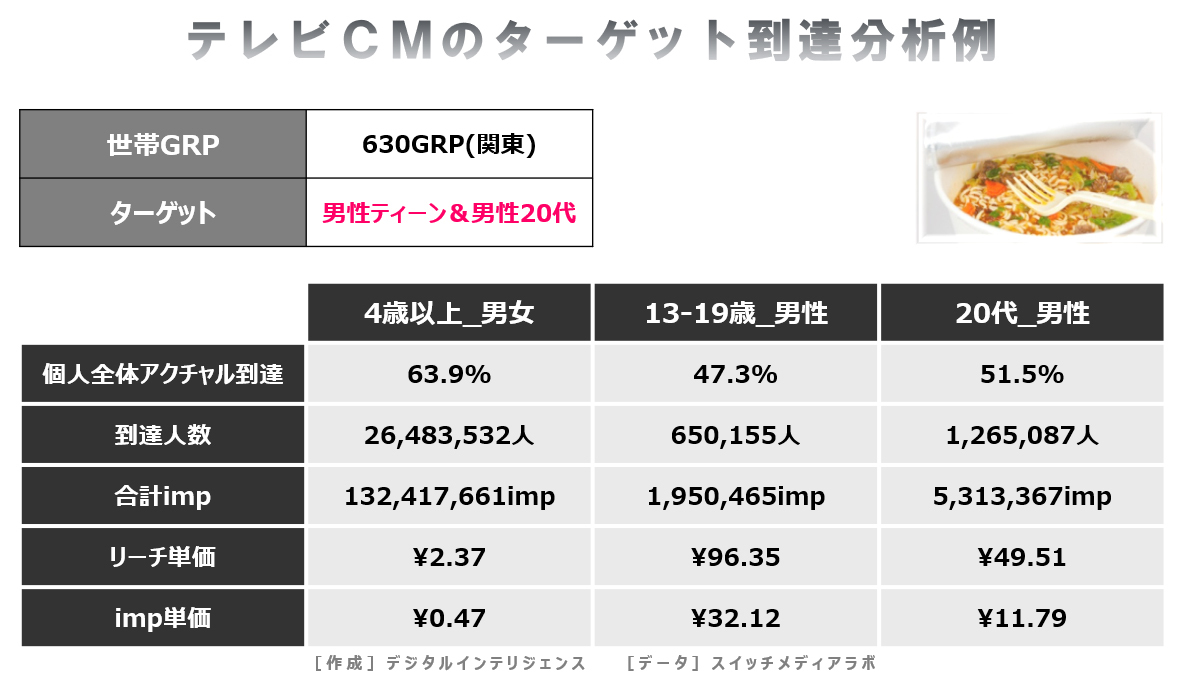これは関東地区でアクチュアル世帯630GRP投下された事例です。商品は、主に男性13~29歳くらいがターゲットと思われます。