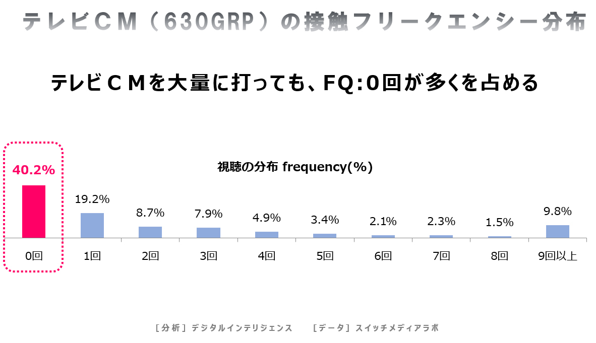 このようなフリークエンシー分布は630GRPと、比較的少ない投下量だから生じるわけではありません。2000GRPにもなると、返ってフリークエンシー過多が厚くなるだけです。