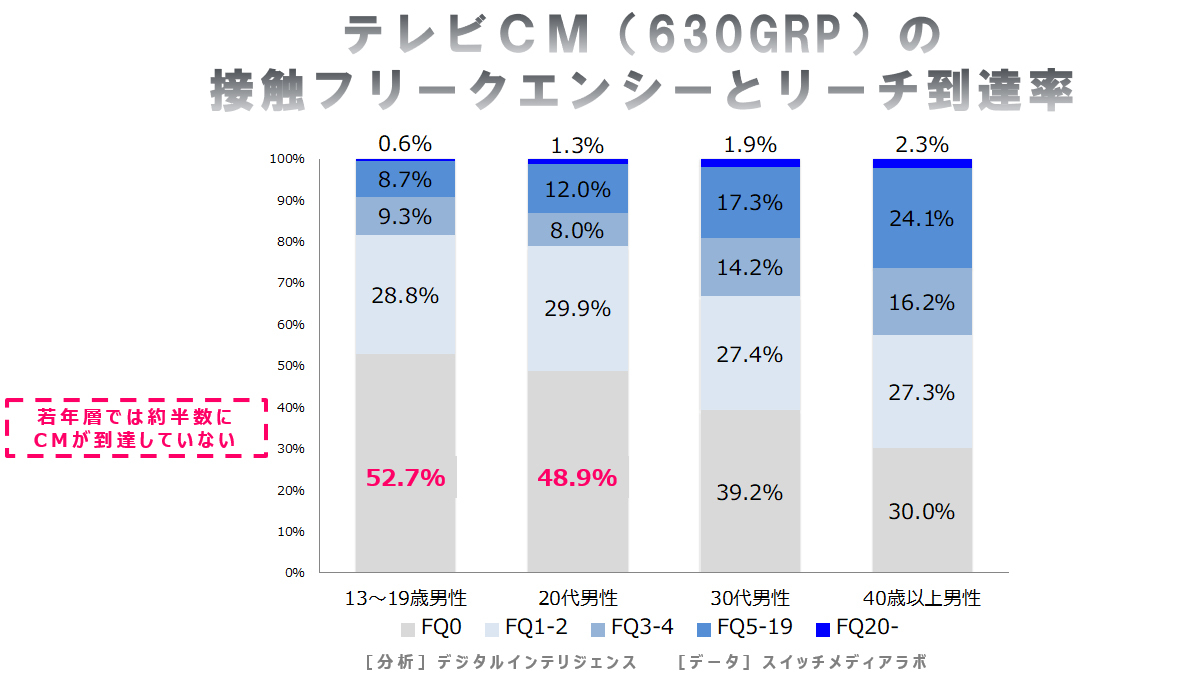 さらにターゲット別にフリークエンシーの分布を見ると、ティーン男性においては、52.7%がゼロ回(未到達)になります。その昔、スリーヒット理論なるものがありましたので、3回以上の接触を効果があるものとすると、18.5%しか効果的な到達になっていないことになります。