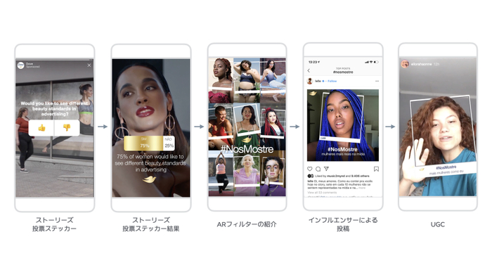 藤田 ユニリーバのトータルビューティーケアブランド「Dove」がブラジルで展開した「Show Us」というInstagramキャンペーンは、プラットフォームを多面的に使って共感を広げ、多くのビジネス指標を押し上げた良い例です。まず、ストーリーズ広告に投票ステッカーをつけるなど、画一的な美に対するオーディエンスの声を集め、それを即座にキャンペーン内容に反映していき、認知を獲得しました。さらに、人々にこの問題へのアクションをとってもらうための仕掛けとして、顔にエフェクトをかけず、ありのままの美を映し出すオリジナルのARフィルターを制作し、社会を巻き込んだ大きなムーブメントを生み出しました。