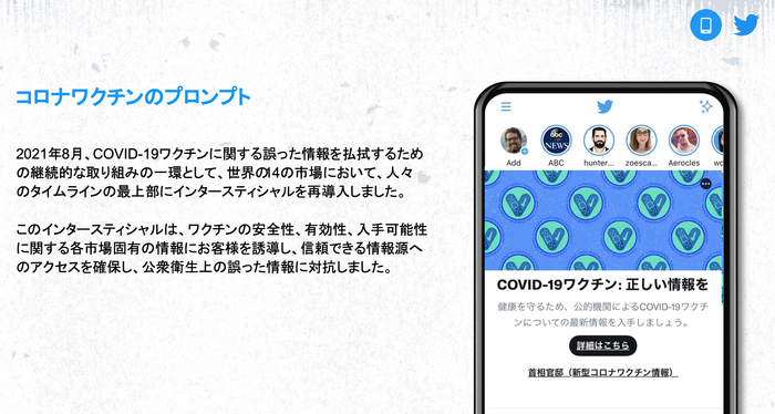 また、ワクチンに関する情報もTwitter上に数多くありますが、「行政府が出している情報を参照してから正しい情報を投稿してください」とアナウンスしています。これは10数カ国で実施したのですが、全ユーザーのタイムラインの最上部に一日一回ログインしたタイミングで、プロンプト(ユーザーに入力や操作を促すメッセージ)が出てきて確認するように促していました。日本であれば、首相官邸の「新型コロナワクチン情報」アカウントへ誘導したという取り組みです。これらは、利用者を誤情報から守るために、正しい情報をTwitterが提供する取り組みですね。