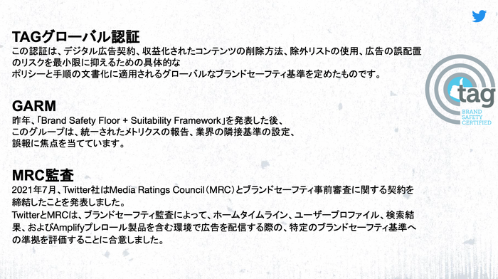 GARMの提言に基づいて、MRCがビューアビリティや無効トラフィック、オーディエンスの測定やブランドセーフティという4つの分野で、より透明性のある測定・指標を提供する取り組みを行い、それにTwitterが協力することにも合意しています。