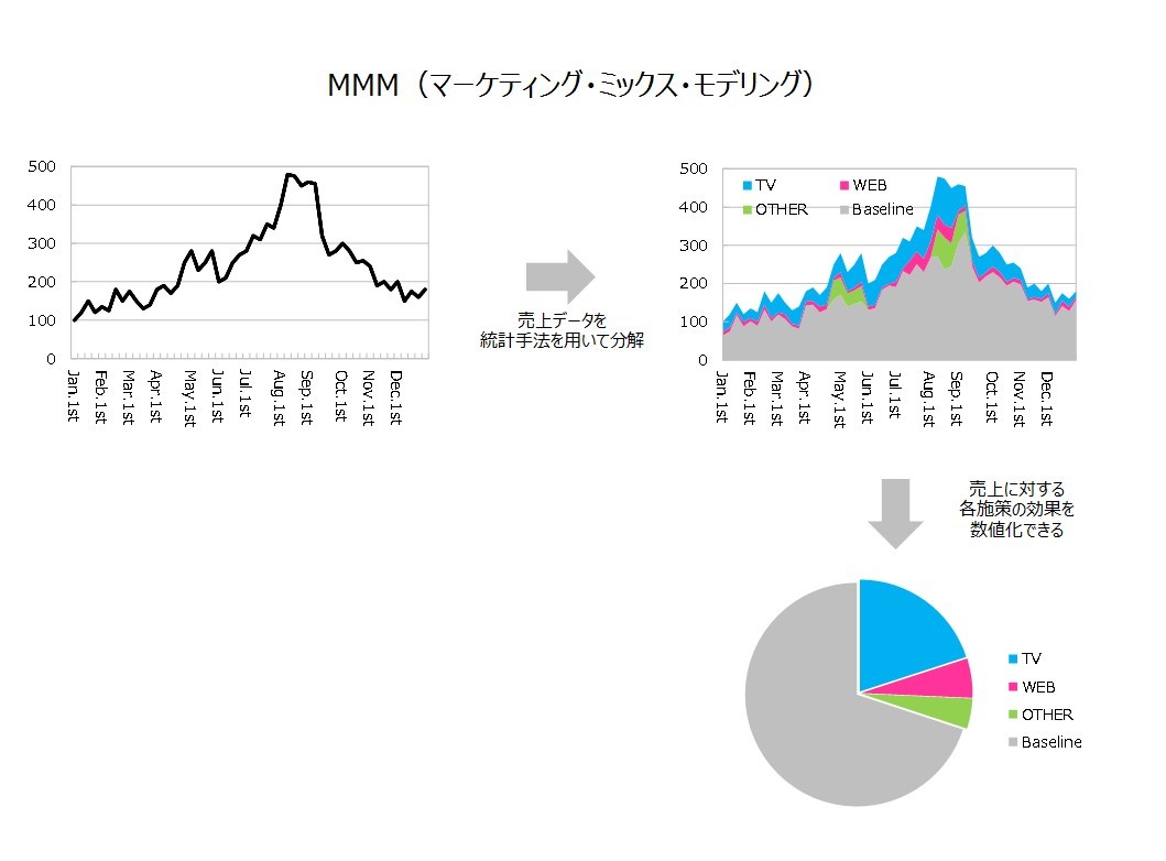 上図の通り、売上を各要因の効果に分解するようなイメージです。あるブランドの1年間の売上が100億円だった場合、Web広告の影響が10%であれば、Web広告によって10億円の売上が増加したことを意味します。