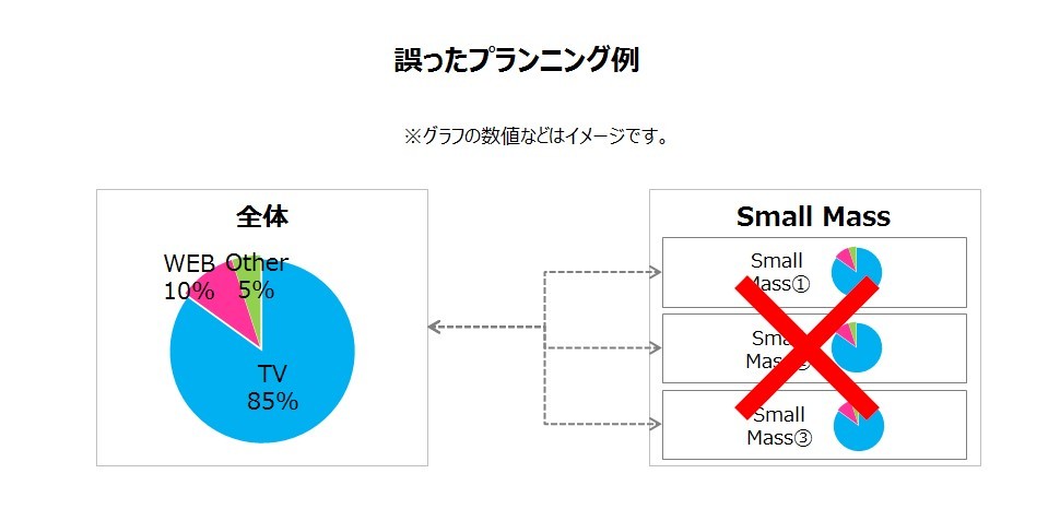 仮に、広告施策の最適予算配分の算出結果が、テレビ広告85%:WEB広告10%:その他広告5%だったとします。この結果をもとに、年間計画などを策定していくことになります。ただし、複数のSmall Massを狙う場合、各Small Massに対するマーケティング活動に対して、この予算比率を全てに当てはめて良い訳ではありません。