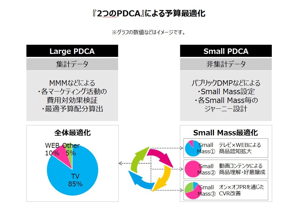 Large PDCAでは各マーケティング活動の費用対効果を再検証したり、年間予算配分の見直しなどを行いながら、同時にSmall PDCAでは、各Small MASSに対するアプローチのチューンナップを行っていきます。Large PDCAとSmall PDCAをループさせることによって、Small Massに根差した真の最適予算配分が完成します。