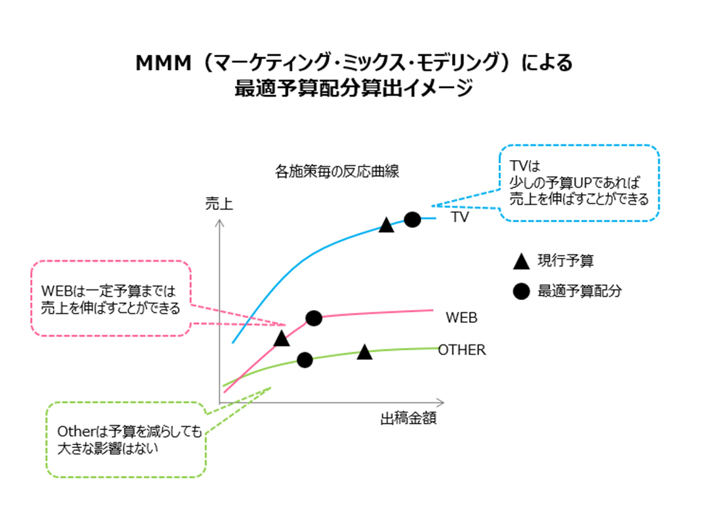 そこで、費用対効果などの算出を行う際には、売上反応曲線というデータ加工を行います(※様々な反応曲線の中から、統計手法を用いて、最も当てはまりの良い反応曲線を選択します)。売上反応曲線を用いることで、各マーケティング施策の予算配分を変更することで、どのくらい売上が増減するかをシミュレーションすることができ、売上が最大となる最適予算配分を算出することも可能となります。