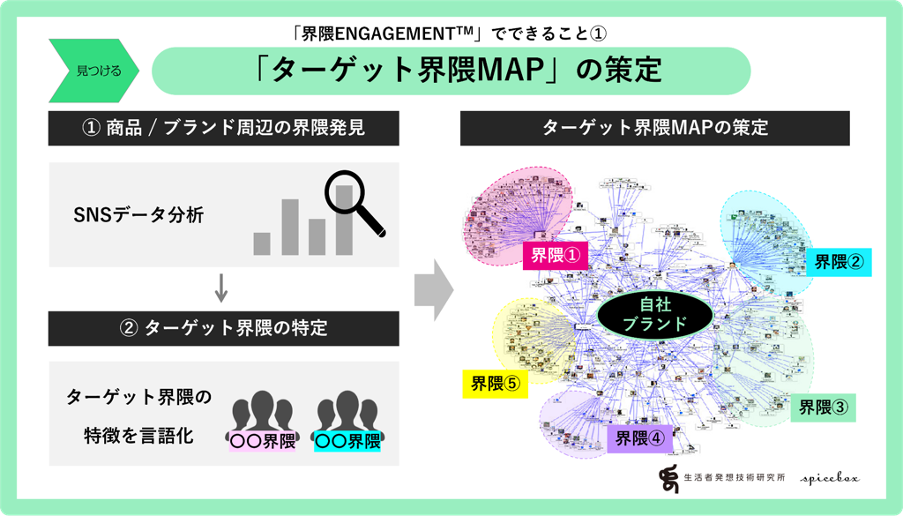 まずSNS上の投稿データを分析することで、自社商品や自社ブランドに関連しうる「界隈」をターゲット候補として発見する。それぞれの「界隈」がターゲットとして有効かどうかを検証・選定するための「ターゲット界隈MAP」の作成を行う。