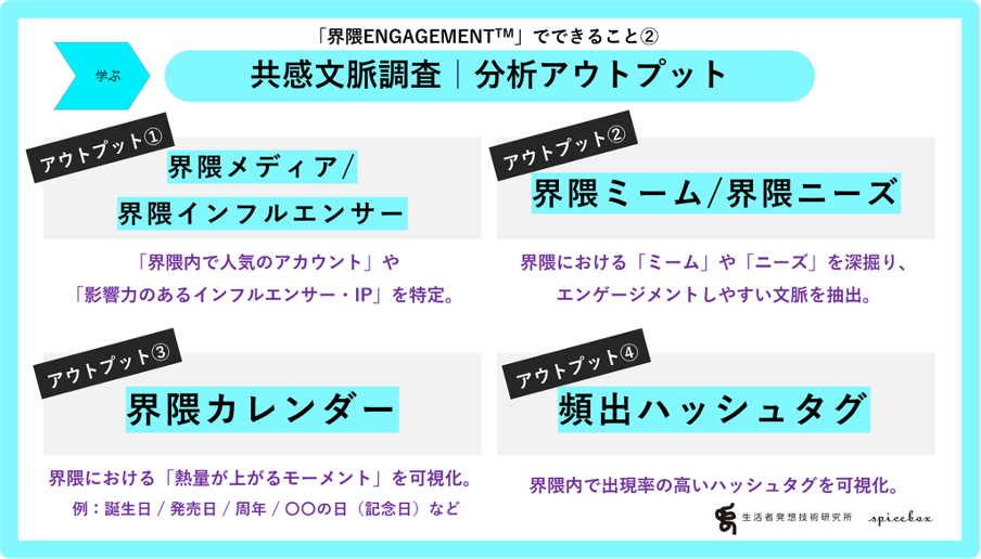 博報堂は2024年に「界隈消費」に関するレポートを発表し、マーケティングプロセスとして「見つける」(自社ブランドと関連しうる生活者の集まりを発見)→「学ぶ」(見つけた人々の常識・課題を知る)→「盛り上げる」(より楽しく過ごせるサービスを提案する)→「広がる」(界隈内外に広がっていく)の4プロセスを提言してきた。今回リリースした「界隈ENGAGEMENT」も、このプロセスに基づいている。
