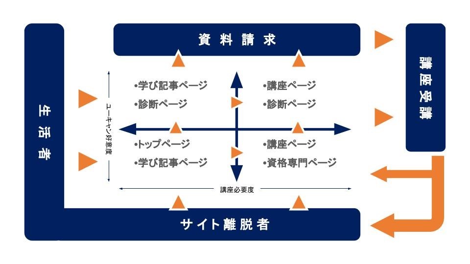 縦軸に自社への好意度、横軸にその講座への必要度とした四象限を配置し、好意度、必要度が低い左下の状態から、どちらも高い右上の状態まで、そのコンテンツがどこに該当するのか、もしくはしないのか、そして配置した場合は既存のどのコンテンツとつなげばより効果が出そうかなどを、この概念図を基準に判断しています。